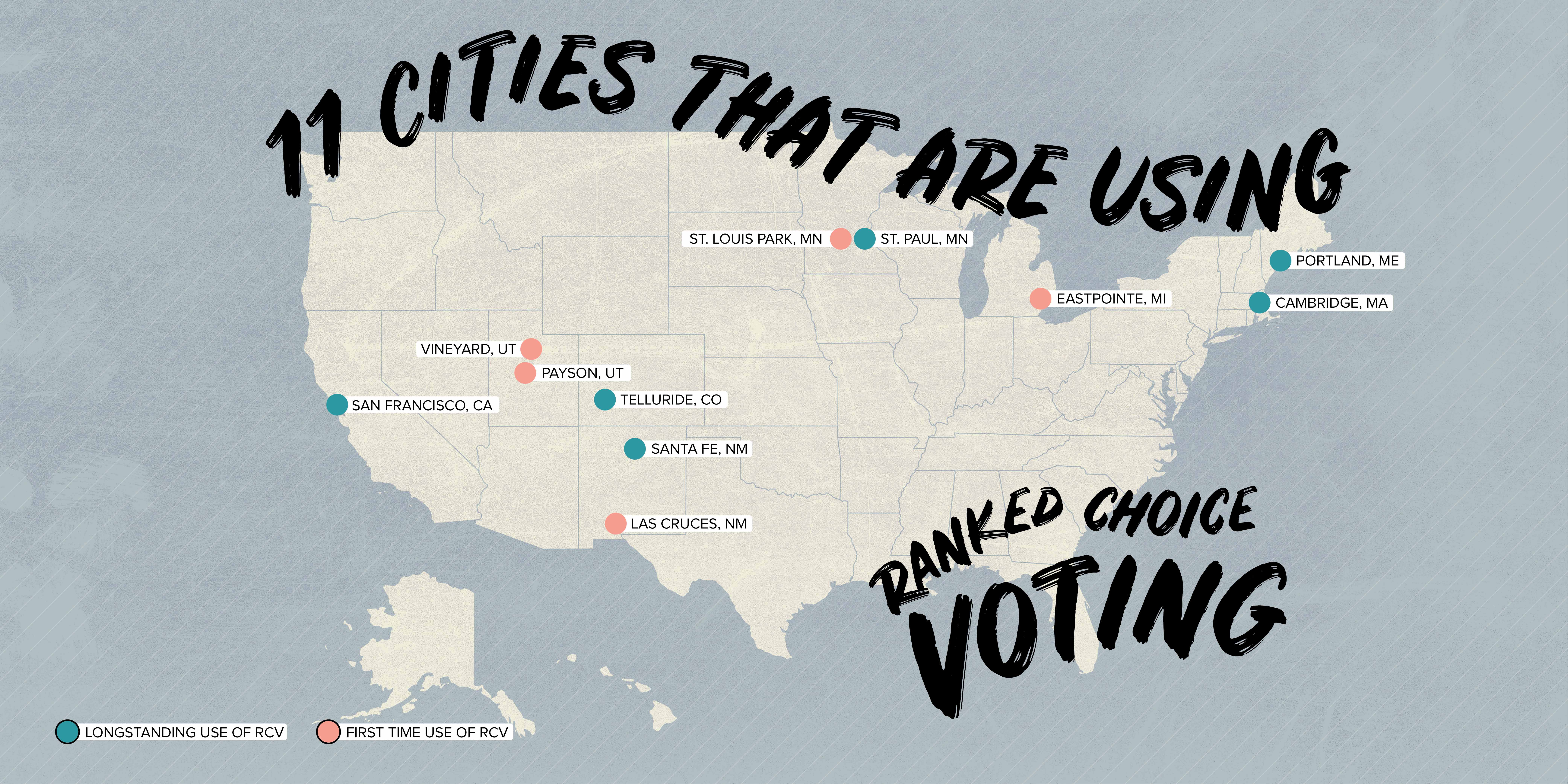 On Tuesday, November 5, 2019, at least 335,556 voters participated in ranked choice voting elections in 11 cities (the number may increase as preliminary results become finalized). Five cities—Las Cruces (NM), Payson (UT), Vineyard (UT), St. Louis Park (MN), and Eastpointe (MI)—used RCV for the very first time. The other six—San Francisco (CA), Santa Fe (NM), Portland (ME), Telluride (CO), St. Paul (MN), and Cambridge (MA)—came back to the system after at least one prior use.