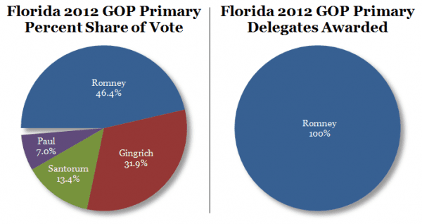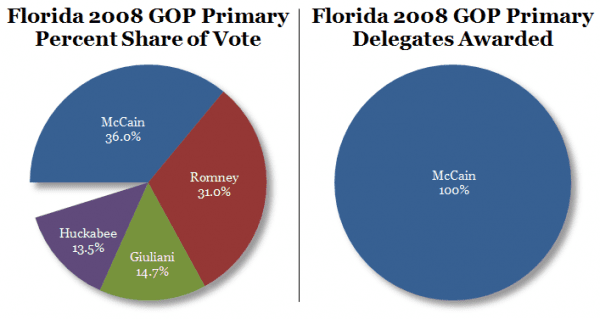 For example, in the 2008 GOP nomination battle between John McCain, Mitt Romney, Mike Huckabee, and Rudy Giuliani, Florida’s January 29 winner-take-all primary proved decisive . McCain, despite winning an unimpressive 36.0% of the vote to Romney’s 31.0% (a mere 5% margin), gathered all 57 of the state’s delegates, or 100%. Like Romney, Giuliani and Huckabee, despite 14.7% and 13.5% of the vote, respectively, received no delegates.