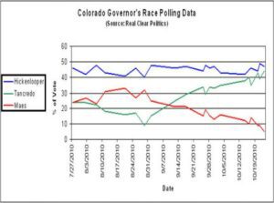 Colorado : There is perhaps no more fascinating race than the one for governor in Colorado. There, the Republican nominee Dan Maes has imploded, with some polls showing him earning as little as 5% of the vote. What’s fascinating is that the results indicate a kind of “slow-motion” instant runoff. As Maes’ vote has dropped, the vote share for Constitution Party (and former Republican Congressman) Tom Tancredo has risen. Throughout these fluctuations, Democratic nominee John Hickenlooper has maintained a consistent share. See below: