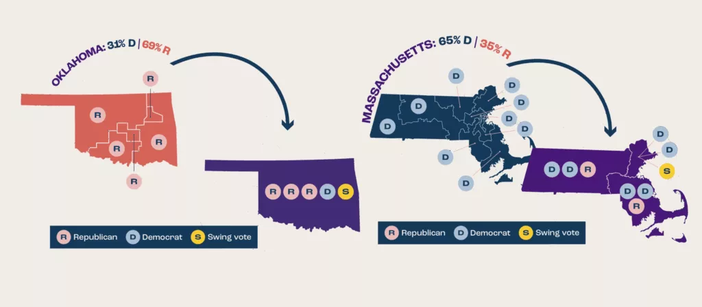 It’s the same situation for Oklahoma Democrats and Massachusetts Republicans, who are geographically dispersed across their states. The Bay State hasn’t elected a Republican member of Congress for over 30 years, even though Republicans routinely win 35 to 40% of the vote there.