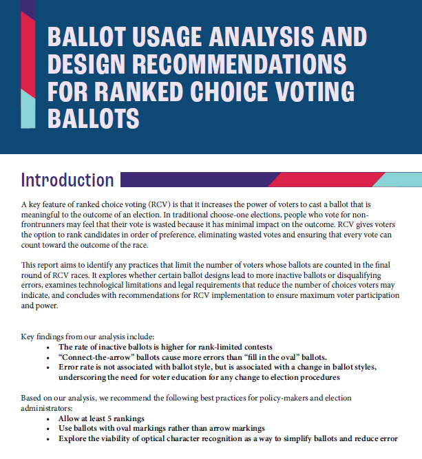 A collaboration between FairVote and the Ranked Choice Voting Resource Center, this report analyzes patterns of ballot use and develops new recommendations for ballot design for policymakers and election administrators.