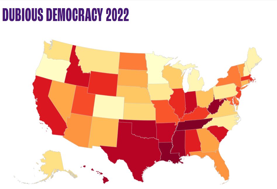 FairVote’s 2022 Dubious Democracy report highlights the overwhelming lack of competition in U.S. House of Representatives elections. We ranked all 50 states on “Voter Voice” based on their performance on five sub-measures: