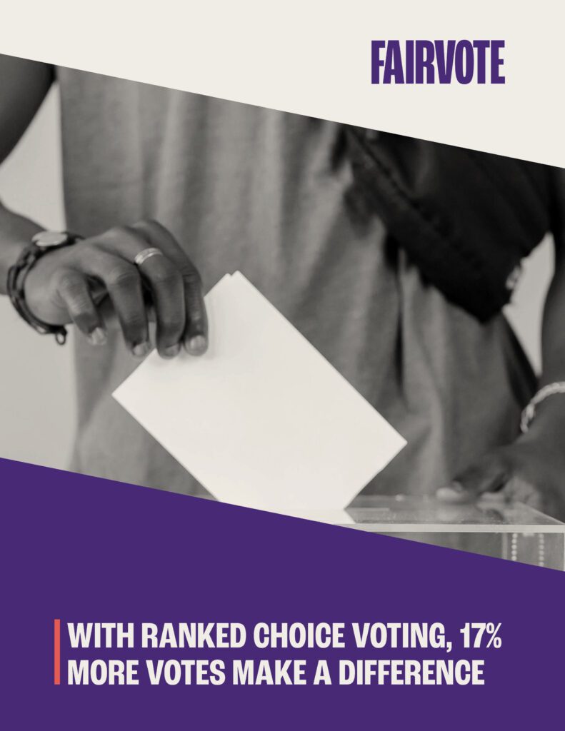 FairVote analyzed the results from single-winner RCV elections in the United States, and found that RCV causes an average of 17% more votes to directly affect the outcome between candidates who actually have a chance at winning – equivalent to millions more voters casting a meaningful vote.