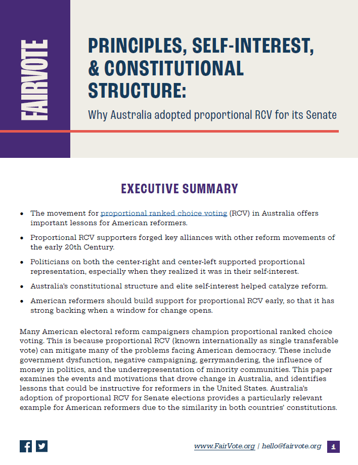 Many American electoral reform campaigners champion proportional ranked choice voting. This is because proportional RCV (known internationally as single transferable vote) can mitigate many of the problems facing American democracy. These include government dysfunction, negative campaigning, gerrymandering, the influence of money in politics, and the underrepresentation of minority communities. This paper examines the events and motivations that drove change in Australia, and identifies lessons that could be instructive for reformers in the United States. Australia’s adoption of proportional RCV for Senate elections provides a particularly relevant example for American reformers due to the similarity in both countries’ constitutions.