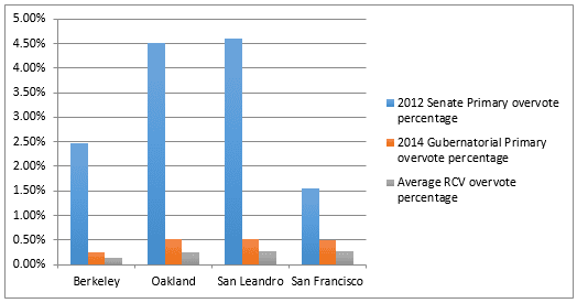 There are no primaries in RCV elections in the four Bay Area cites using it. Voters arrive at the polls once to cast a ballot in the high turnout November election, ranking up to three preferences among candidates. (When new equipment is in place, voters will have additional rankings.) In these Bay Area RCV elections, the average overvote percentages overall are much lower than the 2012 Senate primary overvote percentages in the same cities and lower than in 2014 gubernatorial primary elections. The overvote rate in the 2010 and 2012 RCV elections ranges from 0.14% to 0.28%. In San Francisco, the average RCV overvote rate is five times less than the overvote rate in the 2012 Senate primary and almost half the overvote rate in the 2014 gubernatorial primary. In Berkeley, the average overvote rate in RCV elections is seventeen times lower and 60% lower, respectively. The same story holds for San Leandro, where the RCV overvote rate is seventeen times lower, and almost half the overvote rate, respectively. In Oakland, the average RCV overvote rate is nineteen times lower than the overvote rate in the 2012 Senate primary, and over half the overvote rate as the 2014 gubernatorial primary.